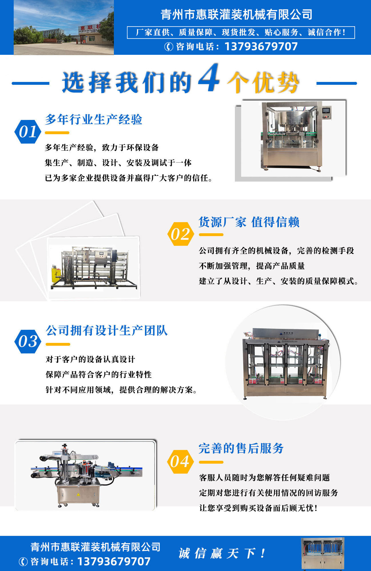 青州市惠聯灌裝機械有限公司是一家集生產研發、銷售、服務于一體的液體灌裝成套設備生產企業,可根據廠家要求設計合理液體灌裝生產線,為用戶提供技術咨詢、設計工藝、場區平面布置、工藝改造、設備安裝調試等完善服務。 公司生產制造各種類型液體灌裝機、過濾機,水處理設備及液體灌裝成套設備。主要產品有:白酒、葡萄酒、黃酒等酒水灌裝機、食用油、機油、潤滑油等油類灌裝機、醬油醋、老抽、生抽等調味品灌裝機、防凍液、玻璃水灌裝機、酒精、84消毒液灌裝機、車用尿素灌裝機、口服液灌裝機、洗滌劑灌裝機等多種液體、膏體灌裝設備,全自動/半自動灌裝機型號多,規格全,洗瓶機、瓶子封口機、打塞機、熱縮機、瓶子烘干機、貼標機、噴碼機、輸送線、裝箱機、水處理設備等全套生產線相關配套設備齊全,自產自銷,一站式購齊,售后無憂。